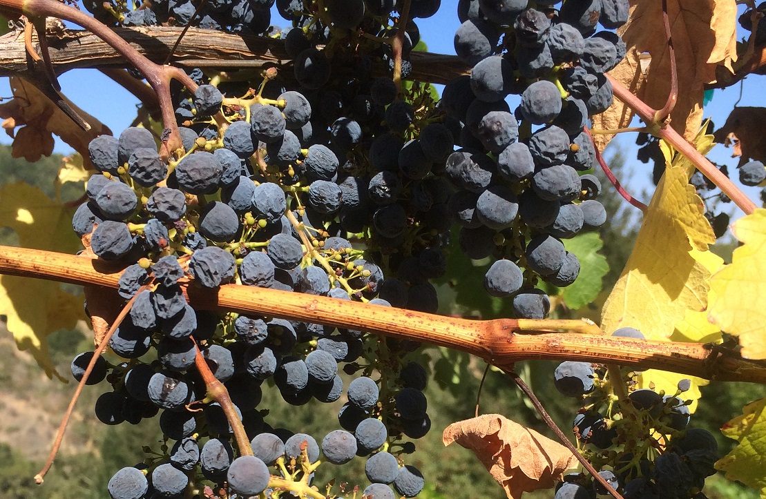9/11/15 ---> 29.7 BRIX in Crouse Block 5 Cabernet Sauvignon after three days of 100F heat at 4:00pm in the afternoon. Substantial dehydration but, the flavor is ready. We are scrambling but will get it picked tonight. Below is a picture of some of this fruit.