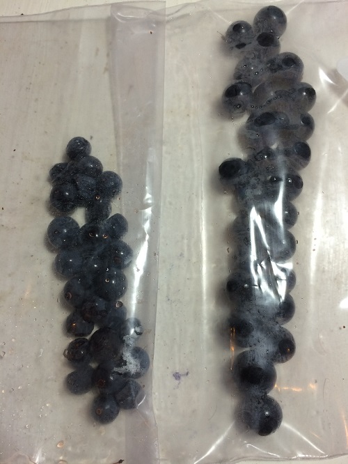 To check this 1g/berry assumption based on the Davis paper I counted berries on 4 of the Camalie clusters with 29 to 35 berries and divided each cluster weight by the berry count to get the weight per berry. I got the following 4 average berry weights/cluster; .54g, .67g,.67g,.68g. averaging to .64g/berry. If we assume the Lag Phase Model which says the weight will double by harvest we get a prediction that these berries will weigh 1.28g/berry, 28% higher than the 1.0 gram assumption but, still well within the 1.0-1.5 range of the Davis Paper. I wish I had some final berry weights and berry counts for the vineyards we are farming. Have to take some this year.