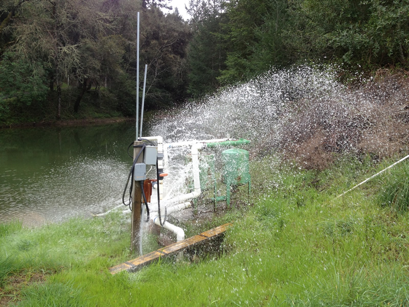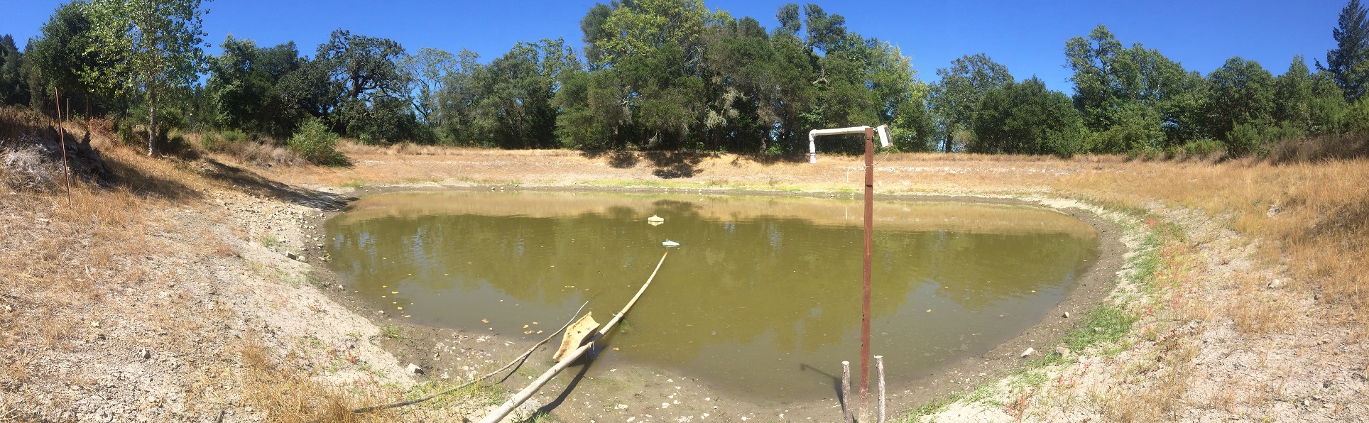 Here's a picture of Dr. Konrad's pond as of 8/3/15. The bullfrogs seem to be happy but, there is not much water left. Our good neighbors at Domaine Chandon have saved our butts. Note the pond level sensor that was supposed to have detected excessive water loss like a valve being left open. I'ts working now but, the horse is already out of the barn. My bad.