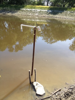 More bad luck was that our monitoring system failed to detect this event. The pressure sensor on the manifold had failed last fall and hadn't been replaced yet. There is also a level sensor installed in the pond intended to alert us to water loss from the pond. You can see it on the pole in this picture of the pond. This sensor was also not functioning. Part of the reason for this (I'm rationalizing) is that we didn't expect to be farming Konrad Vineyards this year, expecting it to be sold and as a result let the monitoring system fall into disrepair.