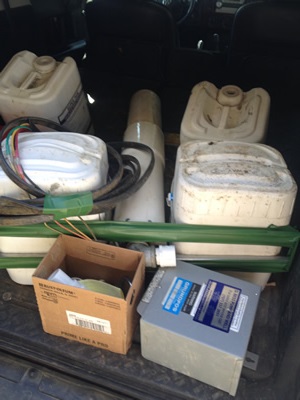 Got the wireless pond pump control working at Crouse Vineyards after a couple of wasp stings. Below is the wireless pump control. The radio and arduino microcontroller are in the upper left of the box. This saves me dozens of trips to that reservoir to pump to a tank for gravity feed of irrigation. After a while I will get too lazy to go to the web page to do the pumping and write some code to pump automatically to keep the tank full.