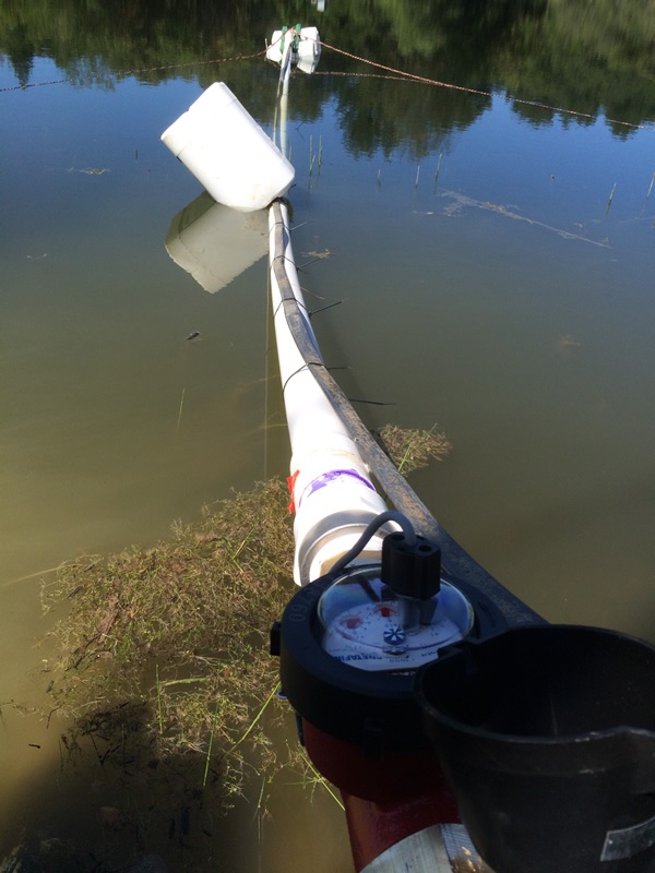 6/18/15 KONRAD PUMP online. After a major installation and plumbing of a . new 1500 ft. 2" line uphill we have a pump in the DC pond and plumbing capable of moving water up to any block at Konrad Vineyards or the pond. To get to the pond takes 185psi at the pump and the flow rate is only 4 gpm but this will work. Thanks to D.Bess Pump and Well for the pump and float structure. See photo to left below.