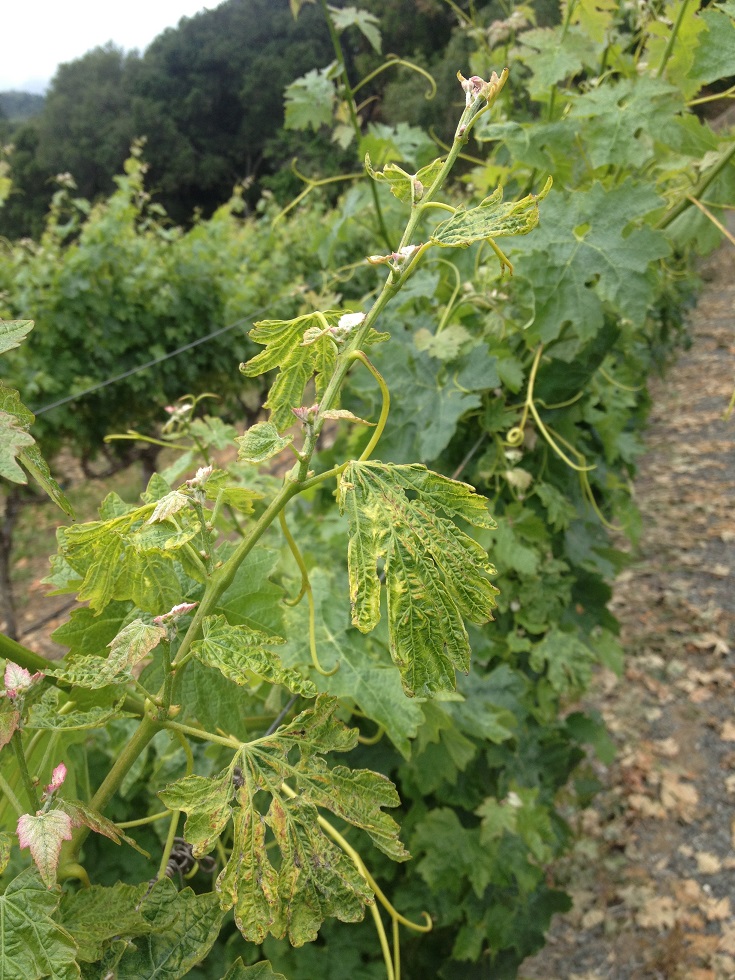 We believe the symptom below is also Pierce's disease at Camalie at bloom, 6/1/15 but, it looks much different from the typical appearance shown above which is from August 15. The vines with this early symptom at Camalie below are not showing symptoms like the above at this time so it may be something else.