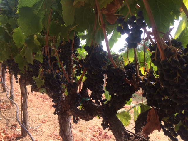9/3/17 11:30am @ ambient Temp 93F after two days of 105F and nights no lower than 80F. The Merlot Brix measured was 26.0 Brix and the block 3 Cabernet Sauvignon in rows 57,58,59 was 23.0 Brix. The vines are showing some stress and the red blotch is starting to show but, the fruit is tasting really good. No worry about it ripening this year. No more green grapes to be seen. Expect an early Harvest. Six days over 100F this year already which I can't remember happening in any other year of the last 17.