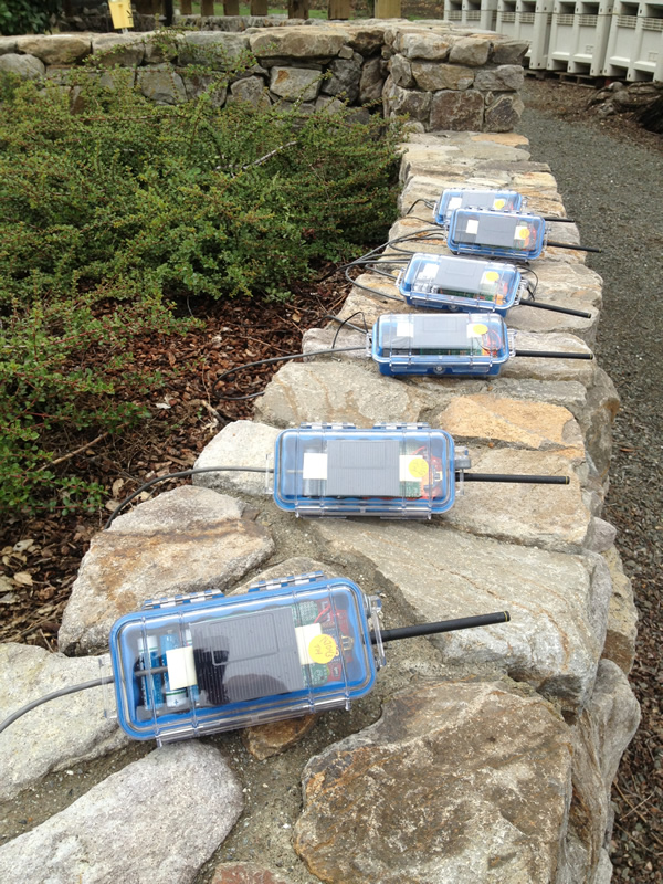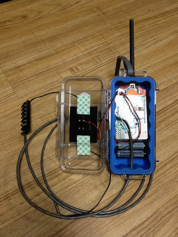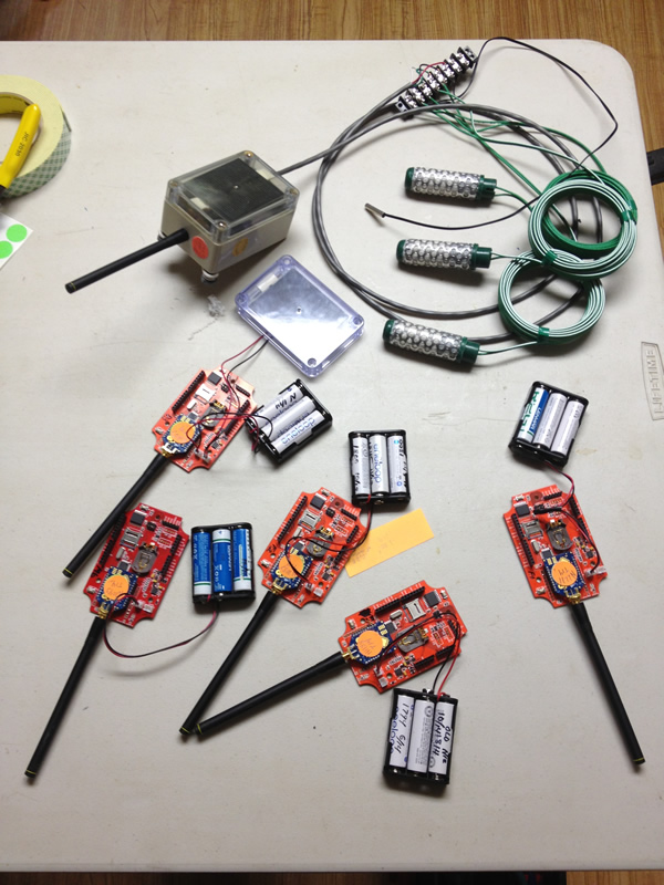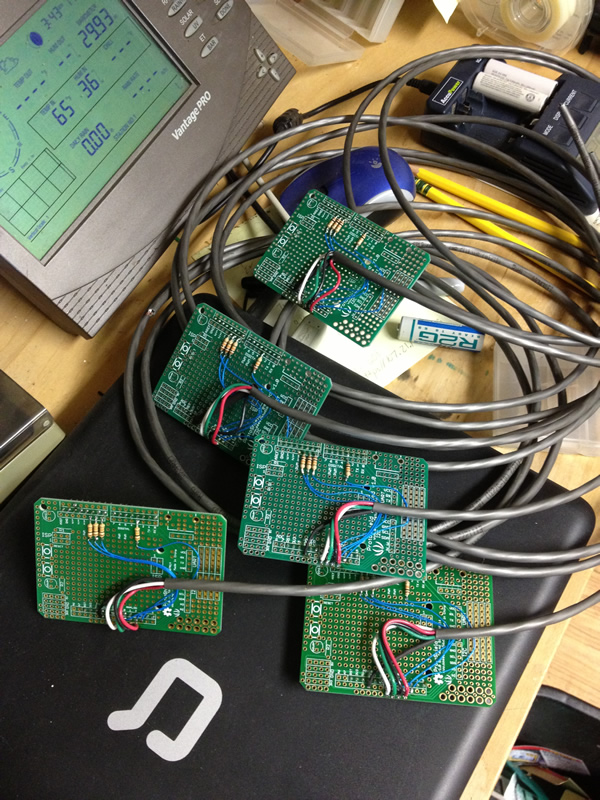 Arduino proto cards with fixed resistors and wiring for sensor connections.