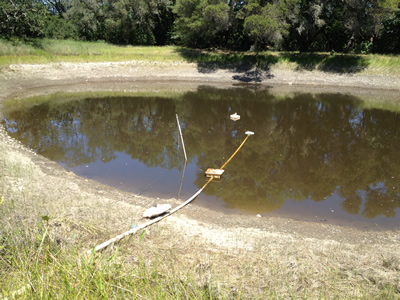Here's a picture of Dr. Konrad's pond as of 8/3/15. The bullfrogs seem to be happy but, there is not much water left. Our good neighbors at Domaine Chandon have saved our butts. Note the pond level sensor that was supposed to have detected excessive water loss like a valve being left open. I'ts working now but, the horse is already out of the barn. My bad.