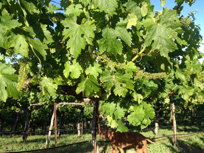 Here is the Malbec at Konrad Vineyards. My shot of bloom was out of focus. You can see some hail damage to the lower leaves on the left in this photo.