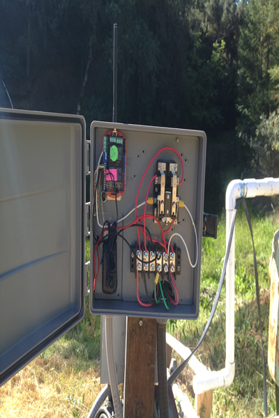 Got the wireless pond pump control working at Crouse Vineyards after a couple of wasp stings. Below is the wireless pump control. The radio and arduino microcontroller are in the upper left of the box. This saves me dozens of trips to that reservoir to pump to a tank for gravity feed of irrigation. After a while I will get too lazy to go to the web page to do the pumping and write some code to pump automatically to keep the tank full.