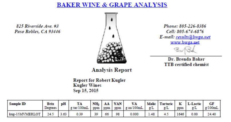 9/15/15 KUGLER JUICE DATA from the tank, Below is the juice panel for the Crouse Block 5 Merlot.