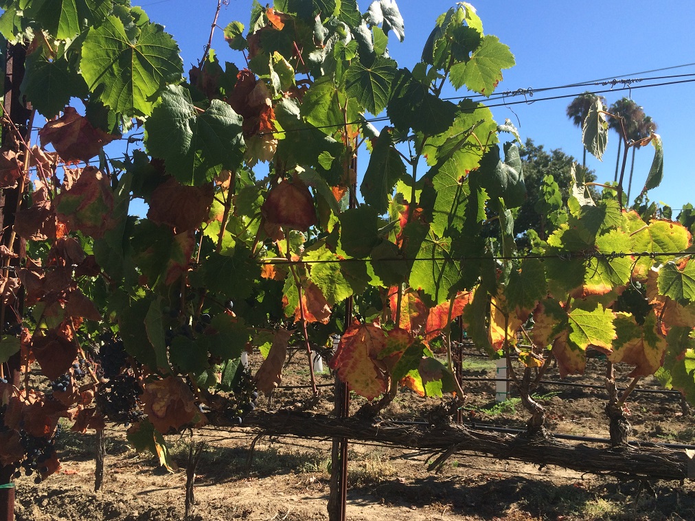 Pierce's disease it showing itself much more than usual this year. Here's a shot from August Vineyards. 15 or 20 vines out of 3000 are showing these symptoms and probably most of the 200 vines we replaced this Spring were dead due to Pierce.