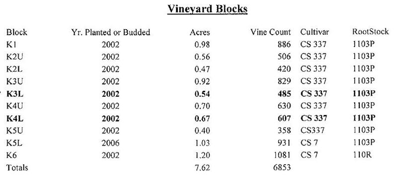 Old Vineyard Accounting. Nine Rows on the East side of block 2 were not accounted for. This caused a half acre/484 vine underestimation of block 2. The borders between the upper and lower portions of blocks K3 and K4 have also changed to reflect how the blocks are currently contracted for sale.