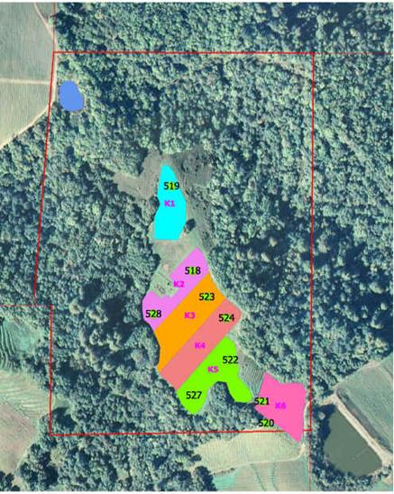 We are interested in selling the grapes by block where the buyer purchases all the grapes yielded by the block(s) he/she selects. Below is a map of the vineyard as it has been divided up for grape contracting. The numbers prefixed with a "K" are irrigation/cultivar block numbers which correspond to the rows in the table below. As of October 2013 Five of the 7 blocks are under long term contract.