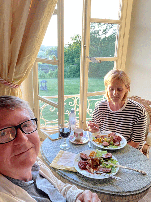 Our Room, the Chambre de Persia. Below, Nanette thinking she had an appetite while recovering from the stomach flu. This was her last bite of the Duck that Natty was so kind to bring us in our room as we tried to keep the stomach flu from spreading to other guests. It seems we were successful. We joined all the guests the next night for an exciting dinner and birthday celebration. On the right is Her Royal Highness resting to get well. We did feel like royalty but, more than that it felt like visting family.