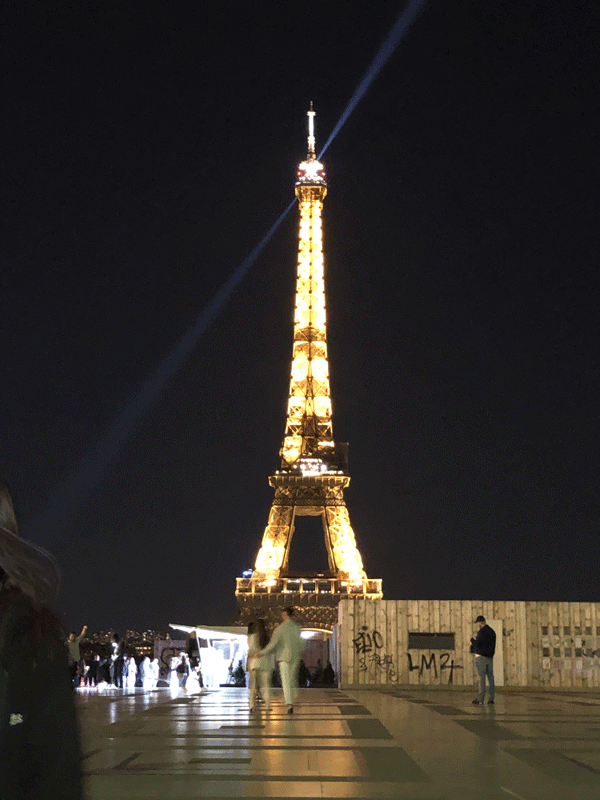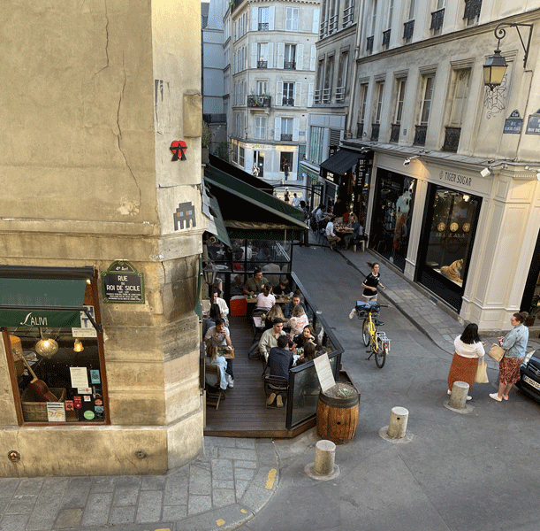 Our apartment on Rue du Roi de Sicele #48 in the Marais district (the Swamp). When we woke up at 3:00am in the morning one day with jet lag we noticed an occasional rat in the street darting around the garbage cans so Nanette decided to try feeding them cheese from our second floor window. Sure enough they spotted the cheese and ate. it. We have video proof if you don't believe us. On the right is the Tiger Sugar store that sells tiger striped drinks loaded with sugar and cafeine.